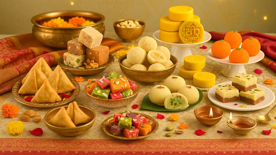 The menu features iconic mithais such as Rasmalai, Kheer Kadam, Malpua, Gulab Jamun, Kheer Cham Cham, Chenna Toast, and khoya-based delights like Kesar Peda, Chocolate Kalakand, and Milk Cake. The range also includes desi ghee specials like Besan Laddu and Kaju Mugdal, premium dry fruit confections, and a line-up of namkeens and flavoured makhanas.