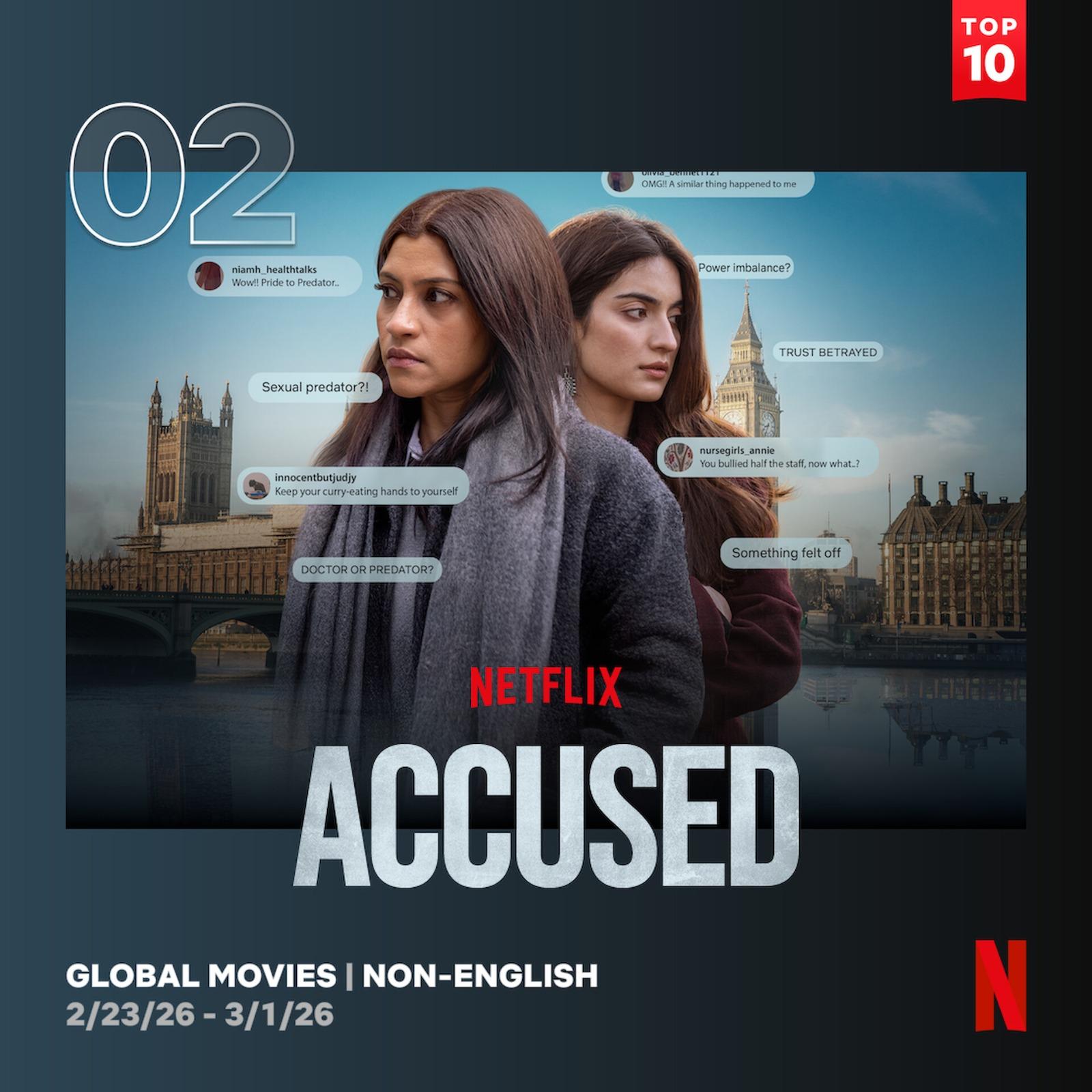 Mumbai, 4th March 2025: Accused, Netflix’s gripping psychological drama directed by Anubhuti Kashyap and starring Konkona Sensharma and Pratibha Rannta, has struck a chord with audiences worldwide. After its release on 27th February, the film is placed at #2 on Netflix’s Global Top 10 Non-English Films and trending in 72 countries, making it the first Indian film to trend in the most countries, reflecting its growing international momentum and a thought-provoking narrative. Konkona Sensharma, who plays Dr Geetika Sen , said, _“It’s incredibly heartening to see Accused finding audiences across the world. Stories that explore complex emotions and uncomfortable truths don’t always have easy answers, so it means a lot that viewers are engaging with the film so deeply. I’m grateful to Netflix for giving this story a global platform, and to audiences everywhere for embracing it with such openness.”_Pratibha Rannta, playing Dr Meera , added, _“The love Accused has received from audiences across countries is truly overwhelming. Being part of a story that sparks conversations about trust, perception and relationships has been very special for me. I’m thankful to Netflix for bringing this film to viewers around the world and to everyone around the globe who supported and trusted our vision.”_Director Anubhuti Kashyap shared, _“As filmmakers, we hope our stories travel beyond boundaries and connect with people in meaningful ways. Seeing Accused resonate with audiences globally and trend on Netflix’s Top 10 is deeply encouraging. I’m grateful to Netflix for championing the film and to audiences everywhere for watching it with such curiosity and generosity.”_Ruchikaa Kapoor Sheikh, Director, Original Films, Netflix India shares, _”In its launch week, Accused ranked in the Weekly Top 10 across 72 countries and debuted at #2 on the Global Top 10 Non-English Films list, underscoring the scale of its global resonance. Anubhuti Kashyap brought a clear, assured vision to Accused, handling a story that breaks new ground with nuance, empathy, and conviction. Konkona and Pratibha Rannta deliver performances that challenge perspectives and stay with you long after the film ends. At Netflix, we’re committed to supporting distinctive voices and stories that push the conversation forward and it’s incredibly meaningful to see a film like this break out globally in a way no Indian film has before.”_Exploring themes of trust, perception and the fragile dynamics of relationships, Accused has sparked conversations among audiences globally. Anchored by powerful performances and Anubhuti Kashyap’s sharp storytelling, the film continues to resonate across borders as viewers engage with its layered, emotionally charged world. Accused is streaming globally, only on Netflix!